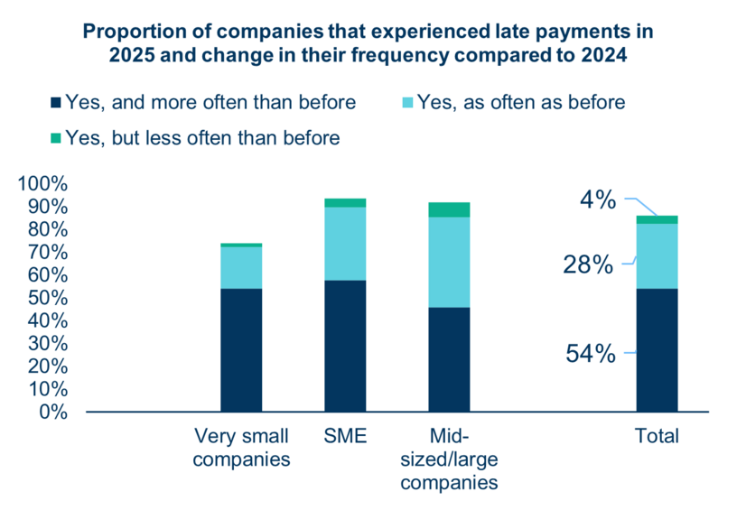 86% van de Franse bedrijven geeft aan de afgelopen 12 maanden te maken te hebben gehad met betalingsachterstanden (tegenover 82% in 2023 en 85% in 2024). Dit fenomeen doet zich in alle sectoren voor, met een bijzonder hoog percentage zeer kleine bedrijven: meer dan de helft van hen beschouwt de impact op hun cashflow nu als ‘kritiek’.