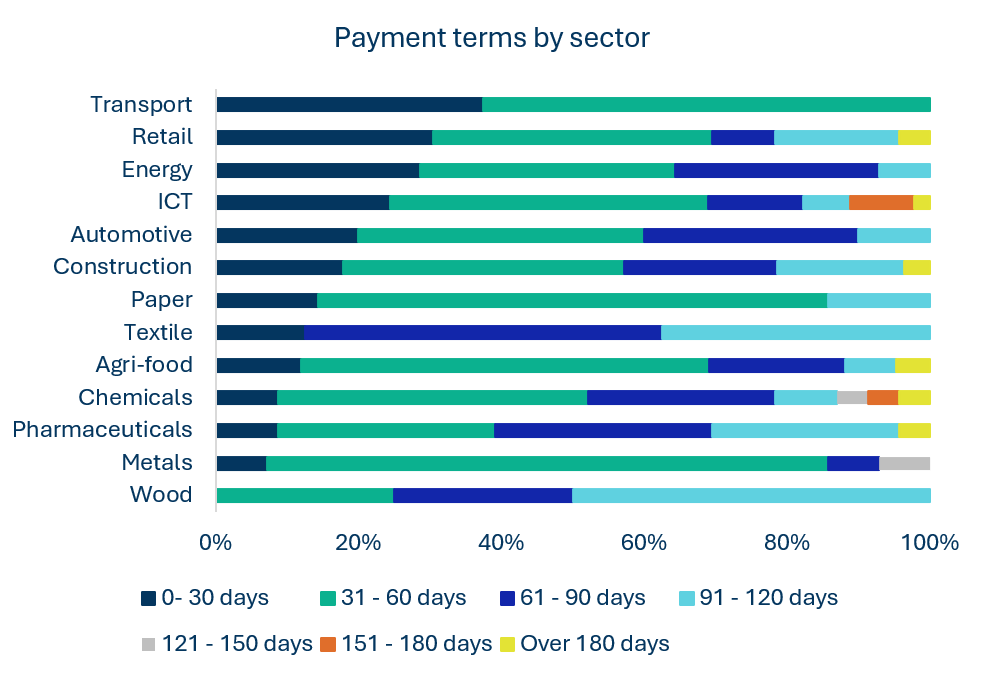 Hout,textiel en farmaceutica bieden de meest genereuze gemiddelde betalingstermijnen, terwijl de transportsector restrictiever blijft.