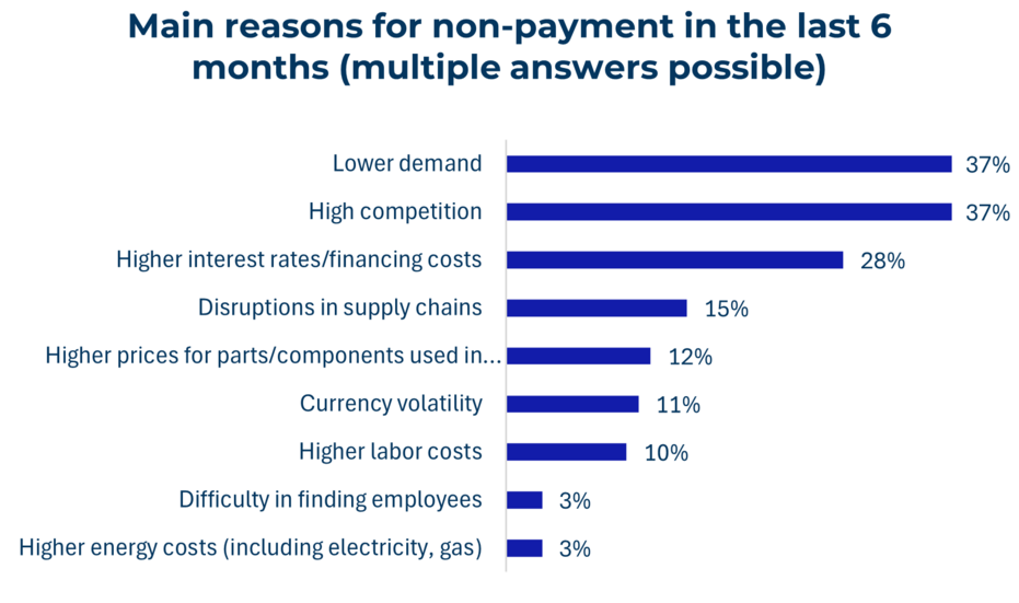 Argentinië en Chili hebben de kortste gemiddelde duur (26-27 dagen), vergeleken met een gemiddelde van 70 dagen voor Ecuador. De meest genoemde oorzaken zijn een zwakke vraag en concurrentiedruk (elk 37%), gevolgd door hoge financieringskosten (28%). Strenge kredietvoorwaarden, met name in Brazilië en Colombia, blijven het vermogen van bedrijven om hun huidige behoeften te financieren beperken, waardoor ze meer blootgesteld worden aan betalingsachterstanden. Wisselkoersvolatiliteit, veranderingen in het handelsbeleid en stijgende arbeidskosten dragen ook bij aan de traditionele beperkingen (concurrentie, geopolitieke spanningen).